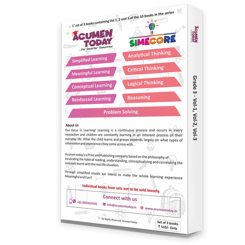 We are into inculcating the habit of reading, learning and correlating the concepts in a simplified, meaningful and enforced manner. We intentionally do not follow a structured approach while we structure the understanding of the concepts by the children in a holistic manner as Math, Science and English go hand in hand. While we have a lot of content/ topics/ subjects and concepts covered, keeping in mind the intelligence of the children, we have not listed the table of content to enable them to go through all the pages and in turn build an element of surprise and an overall development of their skills. We work around the subjects such as Math, Science and English that needs conceptual understanding which would be helpful throughout their career path. We have developed a series of 10 books which covers and slowly builds the concepts recommended by reputed boards of India. Hence each book is planned in a way to be covered/finished in a months? time to accommodate the next volume which would further strengthen the conceptual understanding. Through simplified visuals we intend to make the whole learning experience Meaningful and Fun!! This set of 3 books focuses on the concepts that a 1st graders (3rd std) should know. Concepts covered are: 1. Oceans and Continent. 2. Life cycle of Fish and Frog. 3.Basic needs and classification of living thing. 4.Adjective, Article, Antonym, Synonym, Homonym, Analogy, Similes and metaphors. 5. Number system, concept of long and short, Multiplication. 6.Comprehension, Types of sentence, Nutrition and types. 7.Addition and Subtraction, Tricks and Tips of Addition, subtraction, word problem.