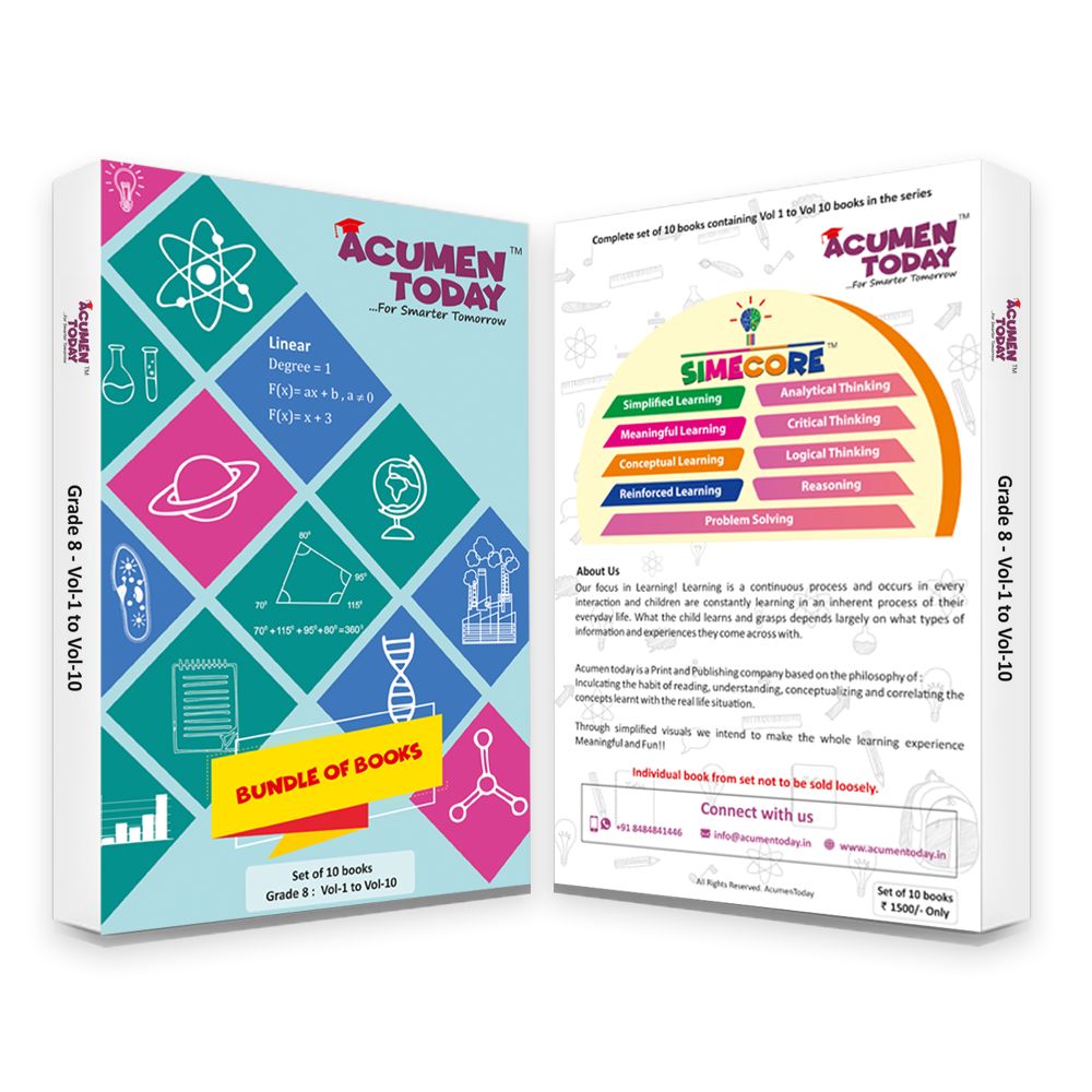 Acumen Today is based on SiMeCoReTM methodology which focuses on Simplified Learning, Meaningful Learning, Conceptual Learning and Reinforced Learning. Through these books we try to make the basic concepts clear and build a strong foundation for grade 9. We include few concepts of grade 7 which are necessary for grade 8 then work on the concepts of grade 8. We take care of the thing that grade 8 is a base for grade 9 and 10. So we focus on the concepts necessary for grade 9 and 10. Each book is planned in a way to be covered in a months? time. To make the learning fun and interesting we have used the simplified visuals and illustrations, tricky methods, tables, flow charts, diagrams etc. For the changes which CBSE board is going to apply in the question paper those we are taking care of, so that students will be familiar with the type of questions like Grids. For reinforcing concepts we have given simple exercises which children will find interesting. Concepts covered in this set of books are 1. Rational Numbers 2. Force and Pressure 3. Clauses 4. Exponent 5. Friction 6. Sound 7. Phrases 8. Light 9. Lens and Human Eye 10. Algebraic Expressions and Identities 11. Factorization of Algebraic Expressions 12. Circle 13. Atom 14. Sentence and Types of Sentence 15. Composition of Matter 16. Metals and Non ? Metals 17. Human Respiratory System 18. Polynomials 19. Variation 20. Construction of Quadrilaterals 21. Data Handling 22. Graphs 23. Micro organisms 24. Coal and Petroleum 25. Combustion and Flame 26. Reproduction in Animals 27. Chemical Effects of Electric Current and Magentism 28. Introduction to Acid and Base 29. Chemical change and Chemical bond 30. Effects of Heat 31. Altitudes and Medians of Triangle 32. Compound Interest 33. Area, Surface Area and Volume 34. Congruence of Triangles