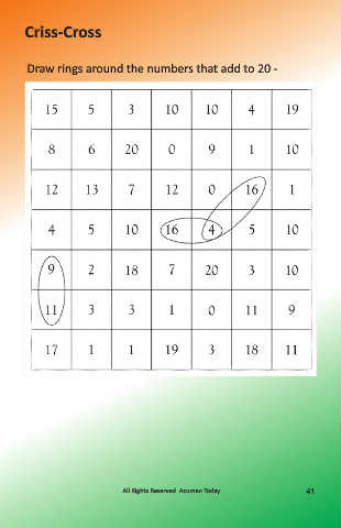 Criss-Cross Draw rings around the numbers that add to 20 - All Rights Reserved. Acumen Today 41