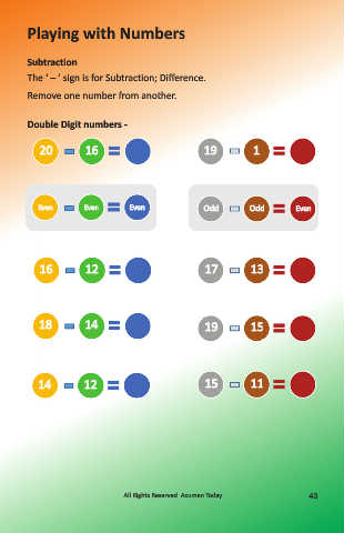 Playing with Numbers Subtraction The ‘ – ’ sign is for Subtraction; Difference. Remove one number from another. Double Digit numbers - 20 16 19 1 Even Even Even Odd Odd Even 16 12 17 13 18 14 19 15 14 12 15 11 All Rights Reserved. Acumen Today 43