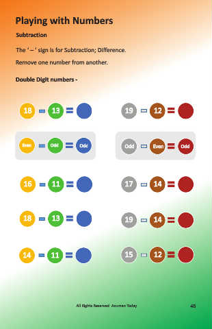 Playing with Numbers Subtraction The ‘ – ’ sign is for Subtraction; Difference. Remove one number from another. Double Digit numbers - 18 13 19 12 Even Odd Odd Odd Even Odd 16 11 17 14 18 13 19 14 14 11 15 12 All Rights Reserved. Acumen Today 45